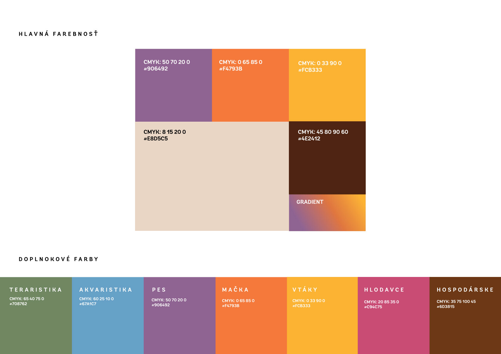 Malé rodinné chovateľské potreby sú zamerané hlavne na psov, mačky a vtáky. K týmto trom domácim miláčikom je vytvorená základná farebnosť firmy. Pridali sme aj doplnkovú farebnosť pre ostatné zvieratká, tak aby sa z nej dala odvodiť farebná škála pre ponuku chovateľských potrieb na firemnej webstránke.