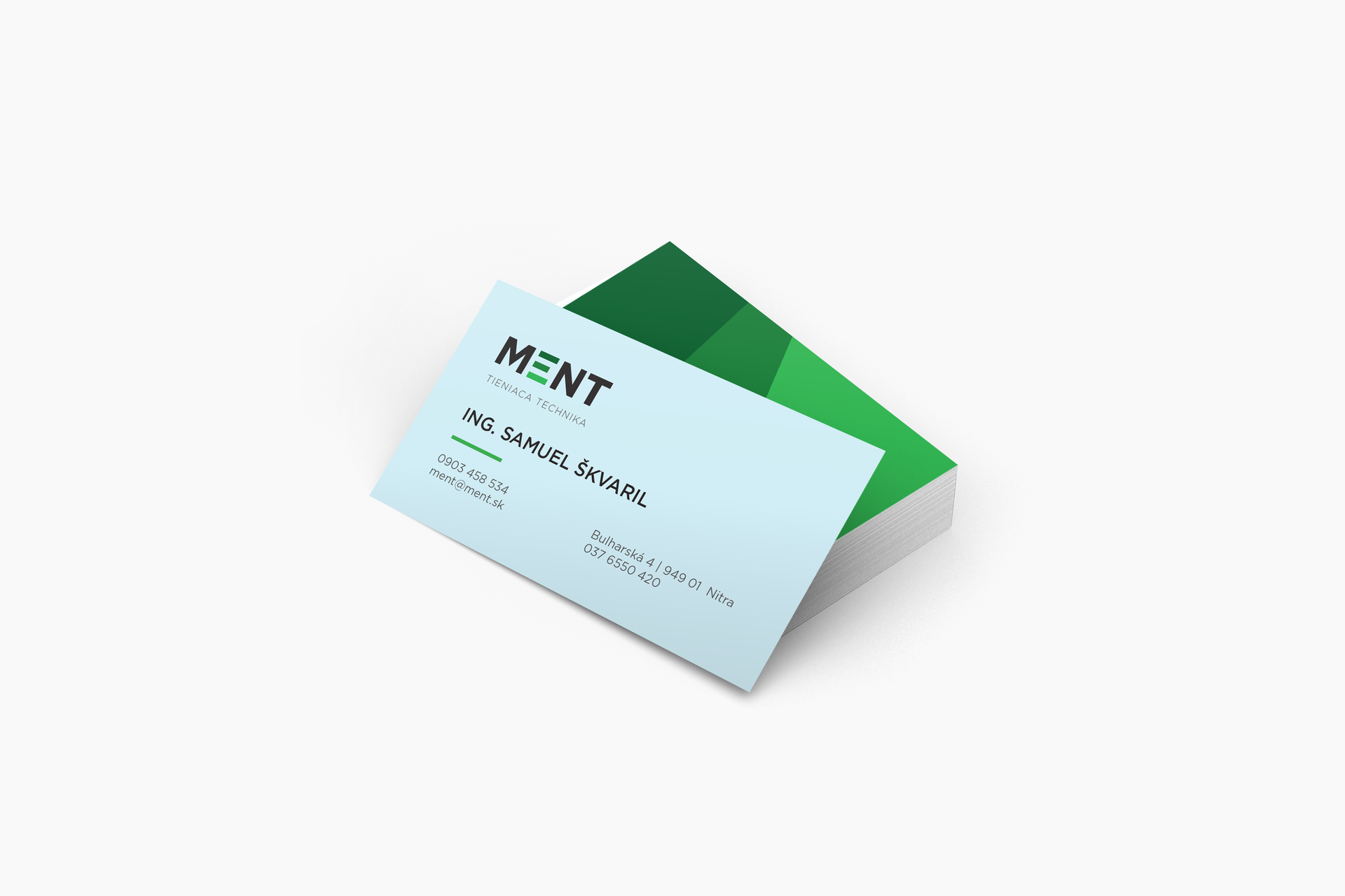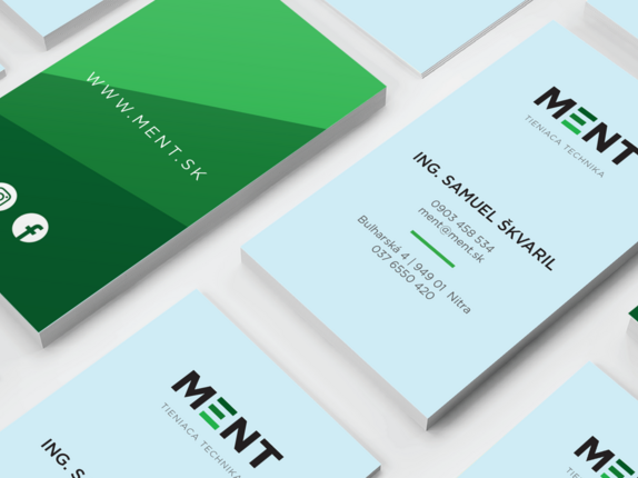 Logo spoločnosti MENT prešlo úpravou. Zjednodušilo sa tak aby sa dalo ľahko aplikovať na akýkoľvek typ reklamných nosičov. Definovali sme firemný typ písma a základnú farebnosť.